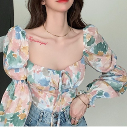 Floral Long Puff Sleeves Cropped Top
